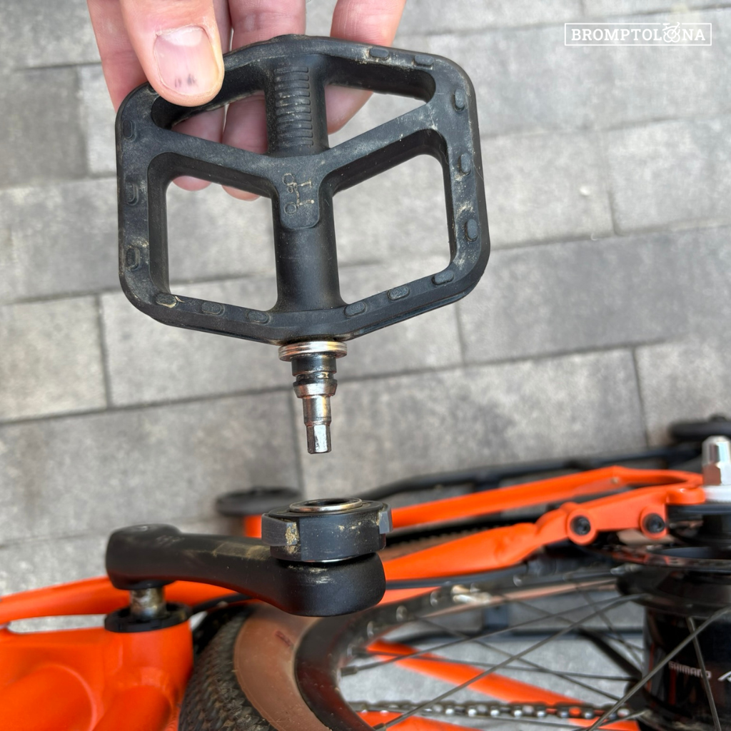 Pero aquí hay una diferencia importante: el pedal izquierdo no se pliega como en otros modelos de Brompton. No es un problema porque se puede quitar y poner muy fácilmente para hacerla más compacta una vez plegada. Es una adaptación que tiene todo el sentido en este modelo más robusto que precisa de una pedalada fuerte.